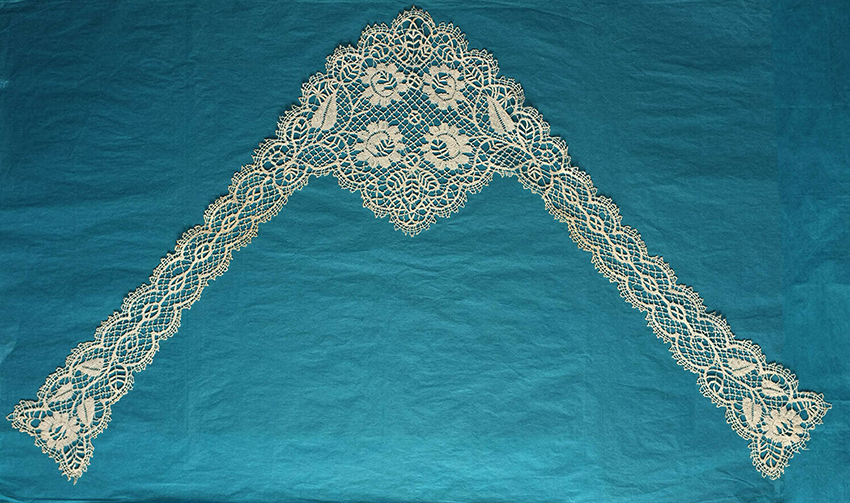Beds lappet scarf 22 cm back to front at center. Center front to each lappet end, 57 cm. Beds fallcap with the lappets attached separately. Flower and leaf design with inner gimp the main textural decoration. Tally fillings in the roses and oval forms. purchased 08/29/2019 |
