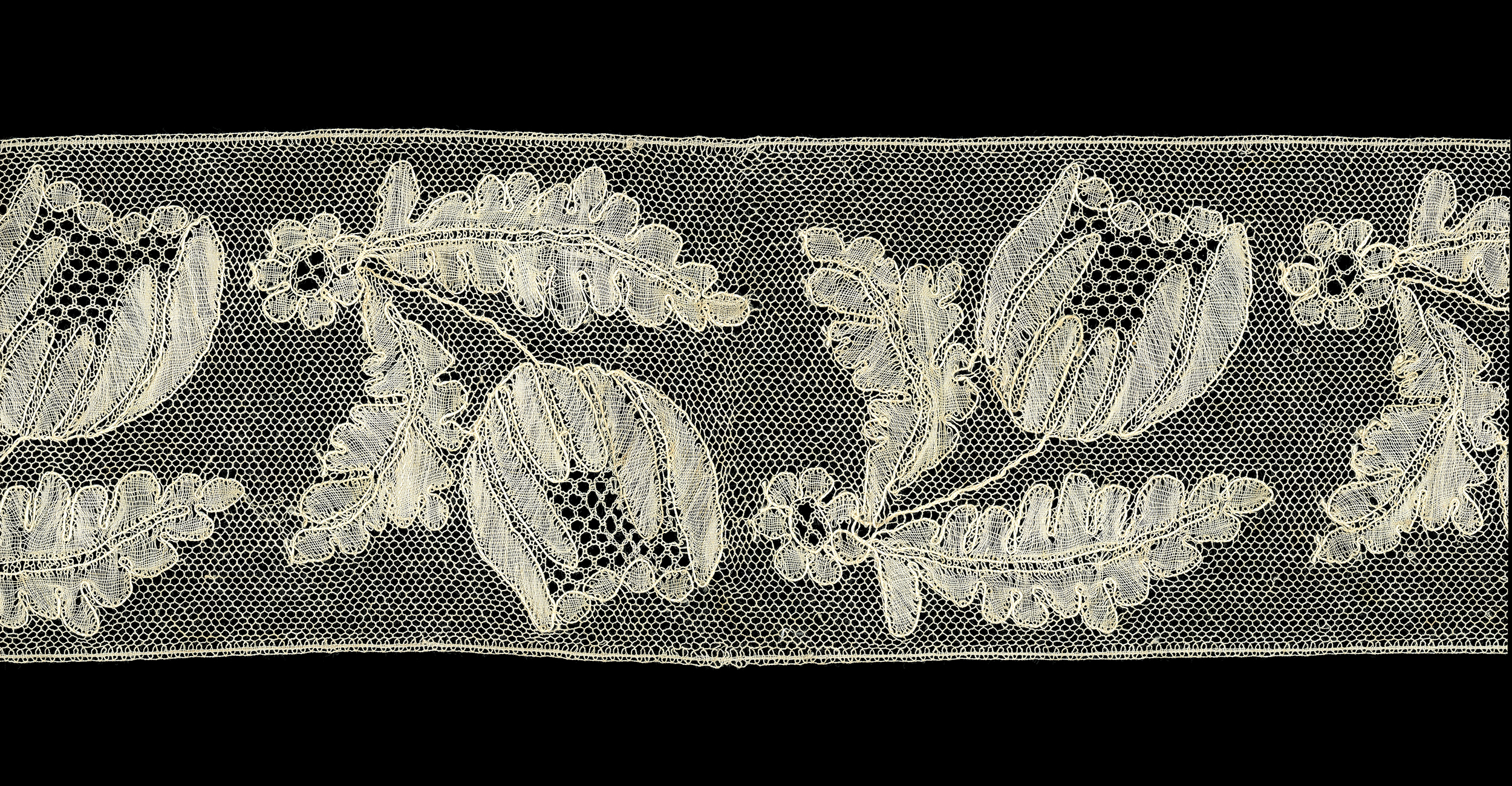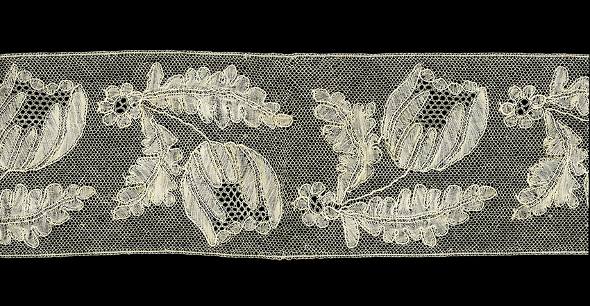 Bucks insertion 4" x 200" The condition of this piece probably indicates that it is a product of the North Bucks Lace Association. It is an insertion of the tulip design, as discussed in the Lace Guild magazine "Lace", pages 14-15, 1987, "The North Bucks Lace Association" by Pamela Nottingham MBE. A similar insertion along with two different widths of a border of this pattern are illustrated in the article. The Association, founded in 1897, revived older designs. purchased 06/16/2019 |