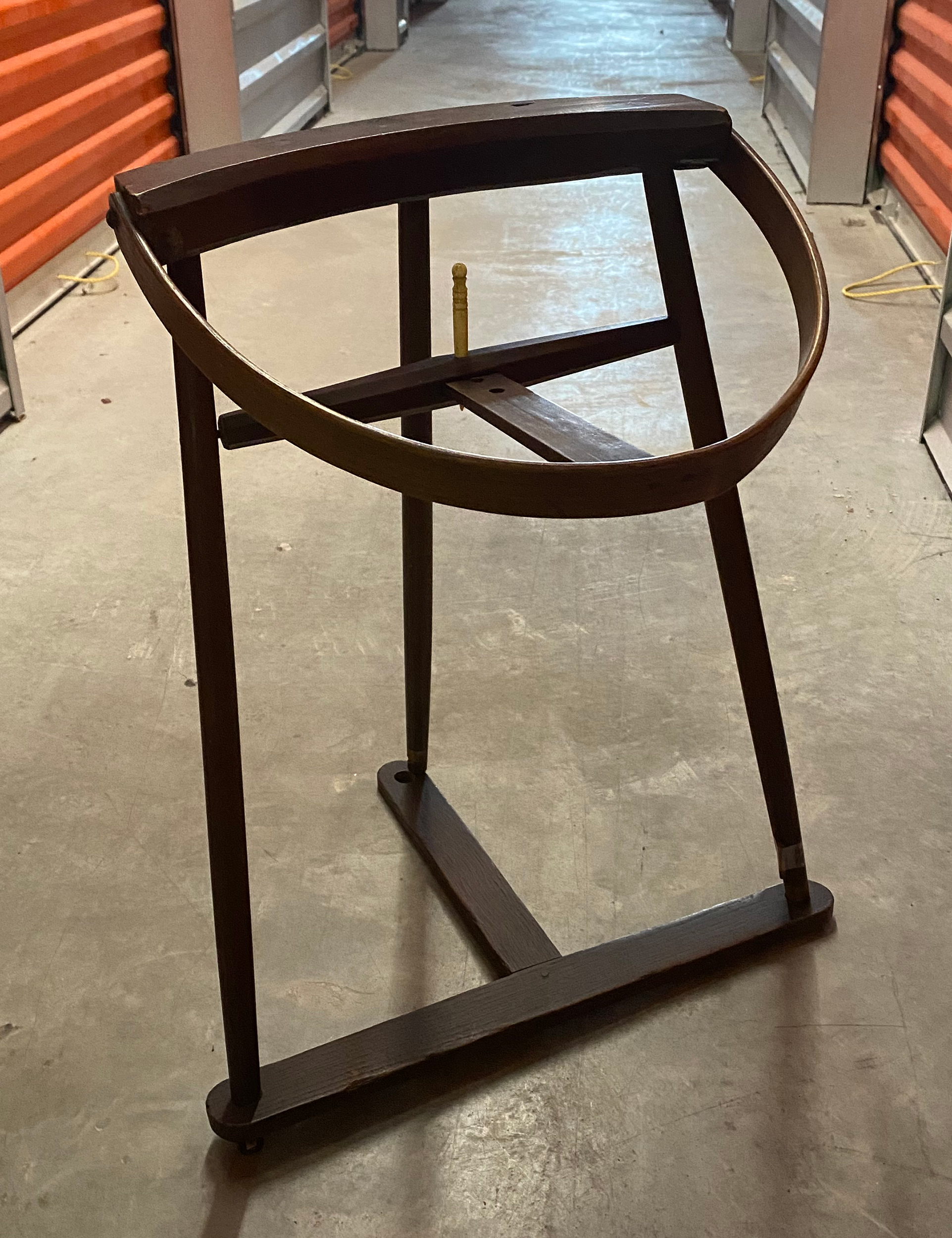 Need Measurements. An unusual adjustable bowed lace pillow horse. The bone peg can be moved to one of three positions, moving the hinged hoop up or down. Taking out the peg allows the hoop to collapse down, probably for storage (check this). Unsure if the peg is original, it seems a little long for the purpose.