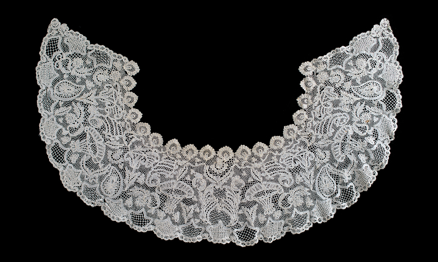 Honiton Collar with plaited grounds need dimensions Small motifs, many and varied fillings. Symmetry a bit off. Treadwin a possible manufacturer. purchased 05/09/2011 |