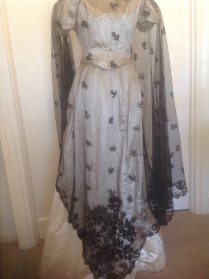 Triangular black Honiton shawl, applique on machine net. Snails/slugs style.