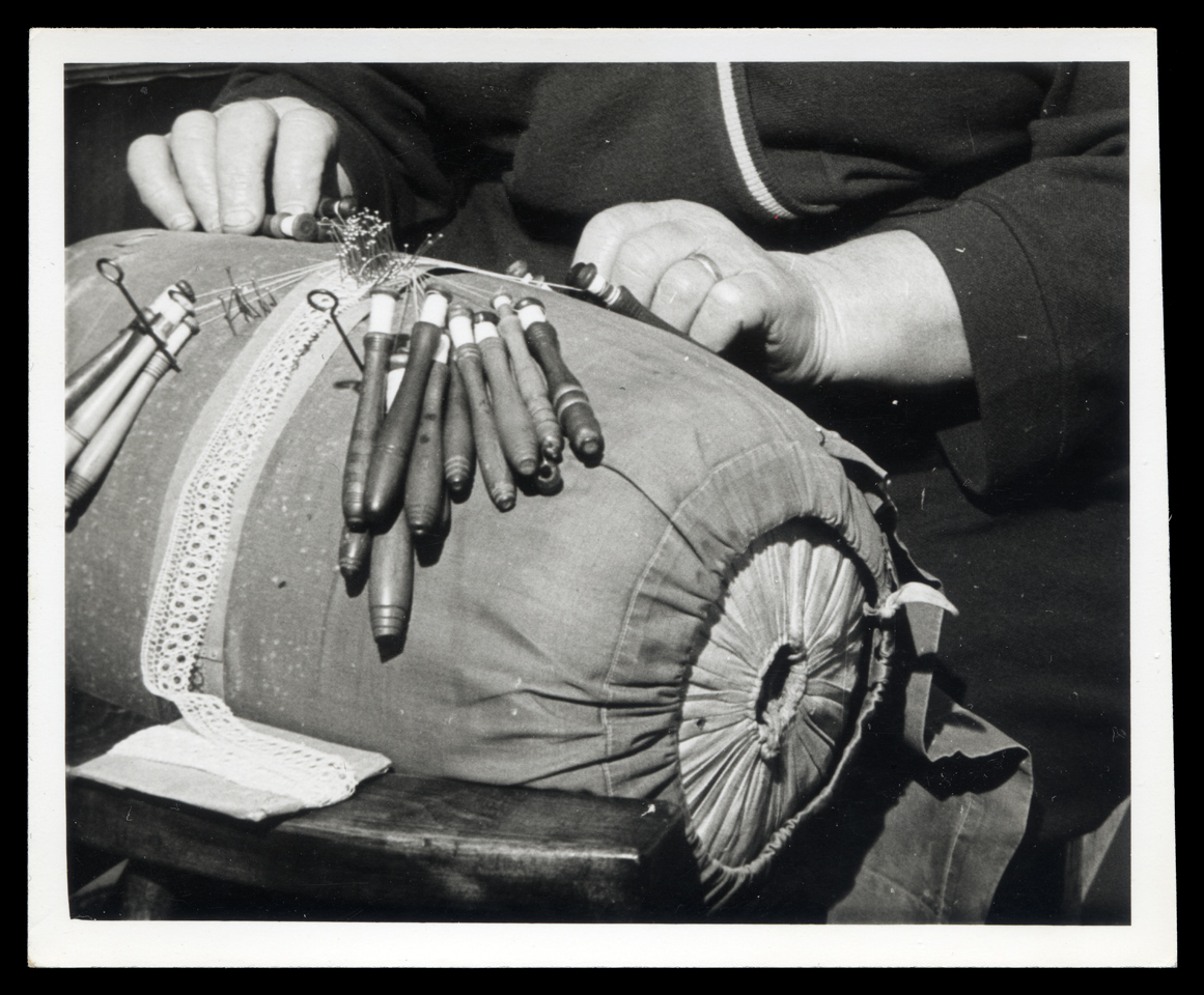 Prestwood Photograph Notes from the photographer, Brian Chilton. I don't know who the lacemaker is. She is working on a large bolster pillow in a folding stand, with South Bucks bobbins. This is a nice ORIGINAL 1960s b/w glossy photo showing a lace maker’s cushion and a card of handmade lace frill. This photo was taken in 1962 at Prestwood, Buckinghamshire when there were still a couple of traditional craft workers in the village. It is a small size photo, approx 4 x3 inches. It is very clean and in very good condition. I can vouch for the authenticity of this one as it was the first “commercial” picture I ever took, earning me the grand sum of 10/-d for this photo and negative which the lace maker wanted to use in the information sheets which she handed out at things like WI meetings and village shows. I kept a couple of the prints for my own photo reference collection. first posted 3/9/2011 |
