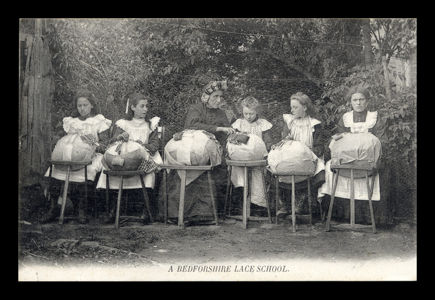 Blake & Edgar's "Picturesque Bedfordshire" Series I assume these two are by the same company - there is one difference on the reverse sides. The first has the "Blake & Edgar's" name, the second does not. Very nicely posed photo. Notice the teacher and student in the center. The next two girls on either side are studying the central action. The outer girls are concentrating on their work, or supposed to be concentrating. The one on the right doesn't seem too happy about the whole thing; she's the most interesting one to me. Another example has come to light which says the lace school was in Marston. first posted 04/05/2009 |