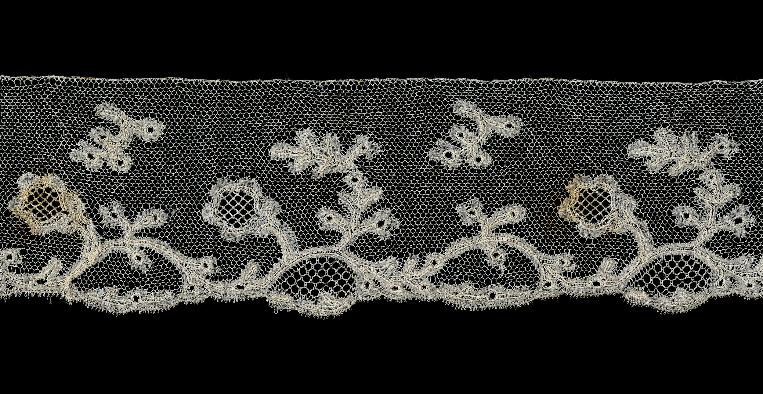 Regency Lace border 8 cm x 250 cm Typical Regency piece with inner gimp. A little coarser than other examples - the thread might be linen. No honeycomb fillings. purchased 01/29/2019 |