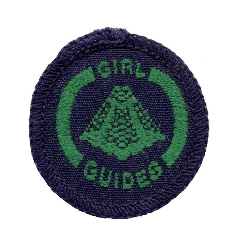 Green on navy blue woven and edge bound, this example ~43 mm across, with "Girl Guides". Black cotton back, early 50's to 1970's.