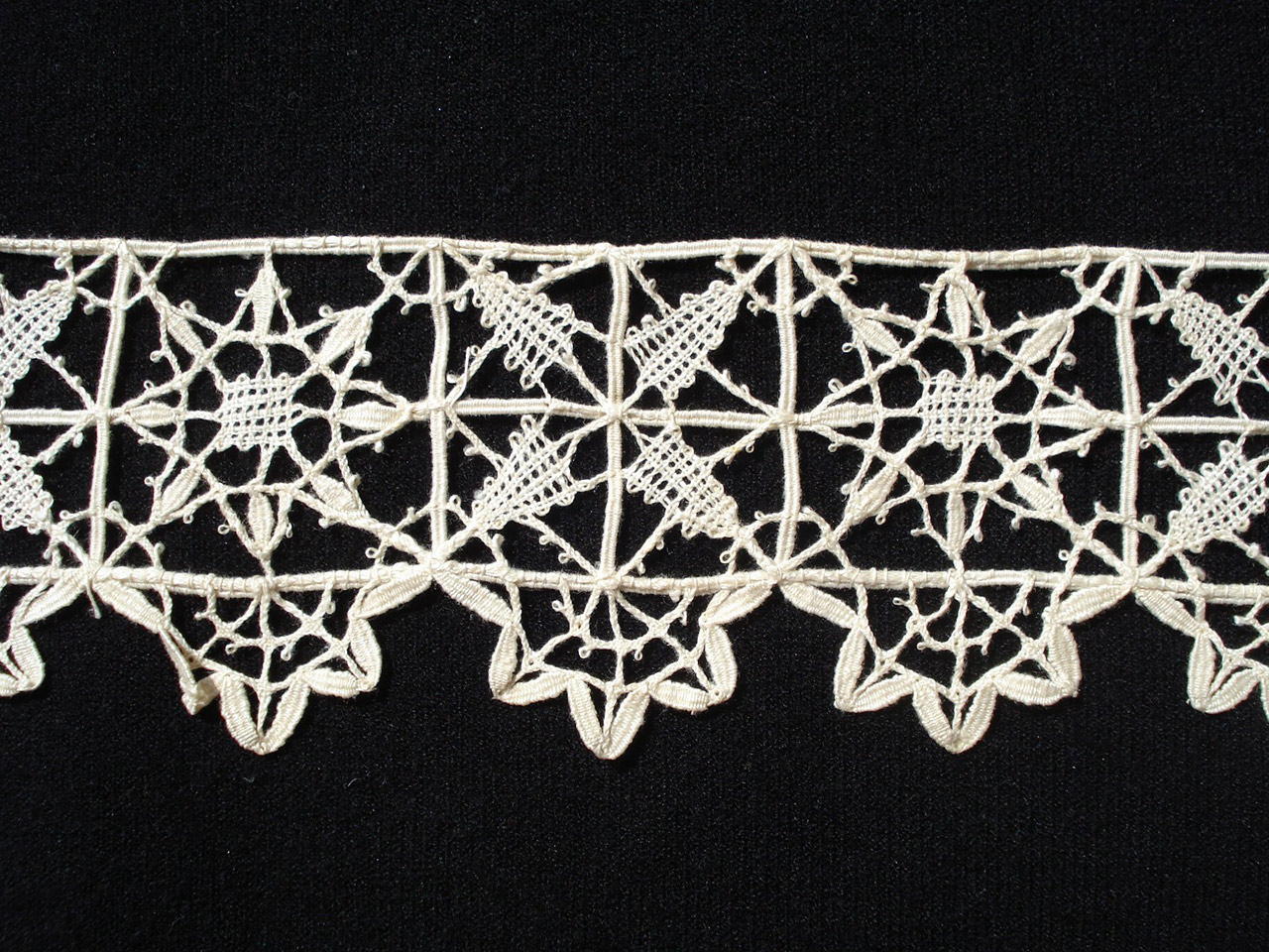 Craponne sur Arzon border 45" x 3" and one short piece Probably a Craponne sur Arzon piece in the more geometric style. Note the 2-thread woven structural elements. purchased 10/15/2011 |