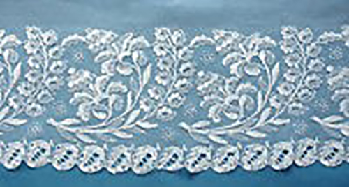 Lille and machine net bonnet_veil 44" x 35" Lower border is probably Lille. This is sewn on to machine tulle for the larger upper part. The tulle is cut to follow the upper outlines of the motifs. The tulle is embroidered along the edges with the same circle/esprit motifs as in the bobbinlace. Looks like the scalloped side edges are also embroidered on the net. The top is folded over to admit a ribbon, which is still threaded through. purchased 05/04/2015 |
