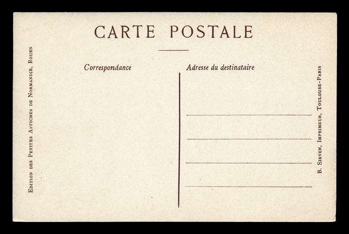 A French law dated November 18, 1903 required that the address side of the postcard be divided into two parts, one for writing a message (Partie réservée à la correspondance) and one for the address (Adresse du destinataire). The two parts needed to be separated by two vertical lines. In 1904 a new regulation required the phrase "tous les pays étranger n'acceptent pas la correspondance au recto (se reinseigner à la poste)" to be printed on all cards; from 1904-1907 the address side was larger, and some of the message was often written on the front of the card. A law dated July 31, 1906 required that the divided back be in two equal parts.