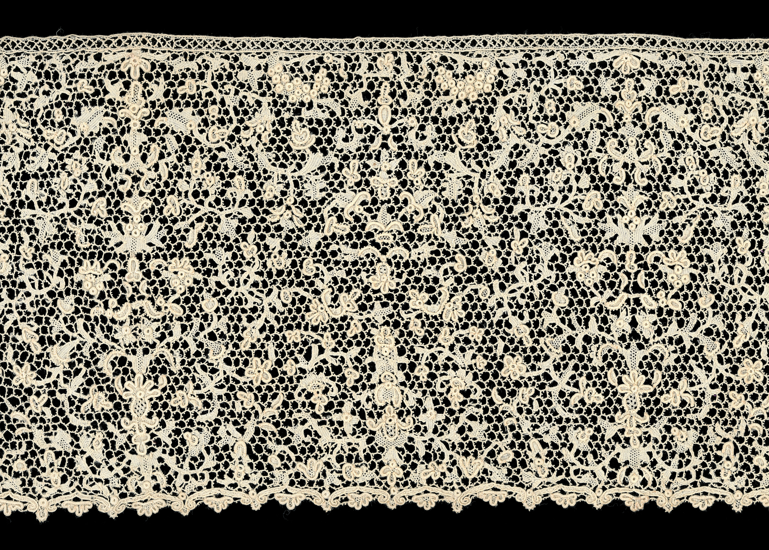 7" x 84" This flounce is cotton, and probably a copying dating from the 1880's or 90's. Ireland at Inishmacsaint, Kenmare or New Ross are possibilities - these specialized in a heavier Gros point before and after this period. During the 80's and 90's a lighter type of lace was in fashion, although illustrated examples of such work are needed. This piece has a typical candelabra pattern with picoted hexagonal brides. But there is no obvious sculpting of the cordonnet, and the many rings are not typical of early French work. Italy is a possibility in this period of time, but comparable examples need to be discovered. The Vienna Lace School might also have been capable of such a piece. Until more clarification is obtained, it will live in the 'Point de France' category as an example of the style.