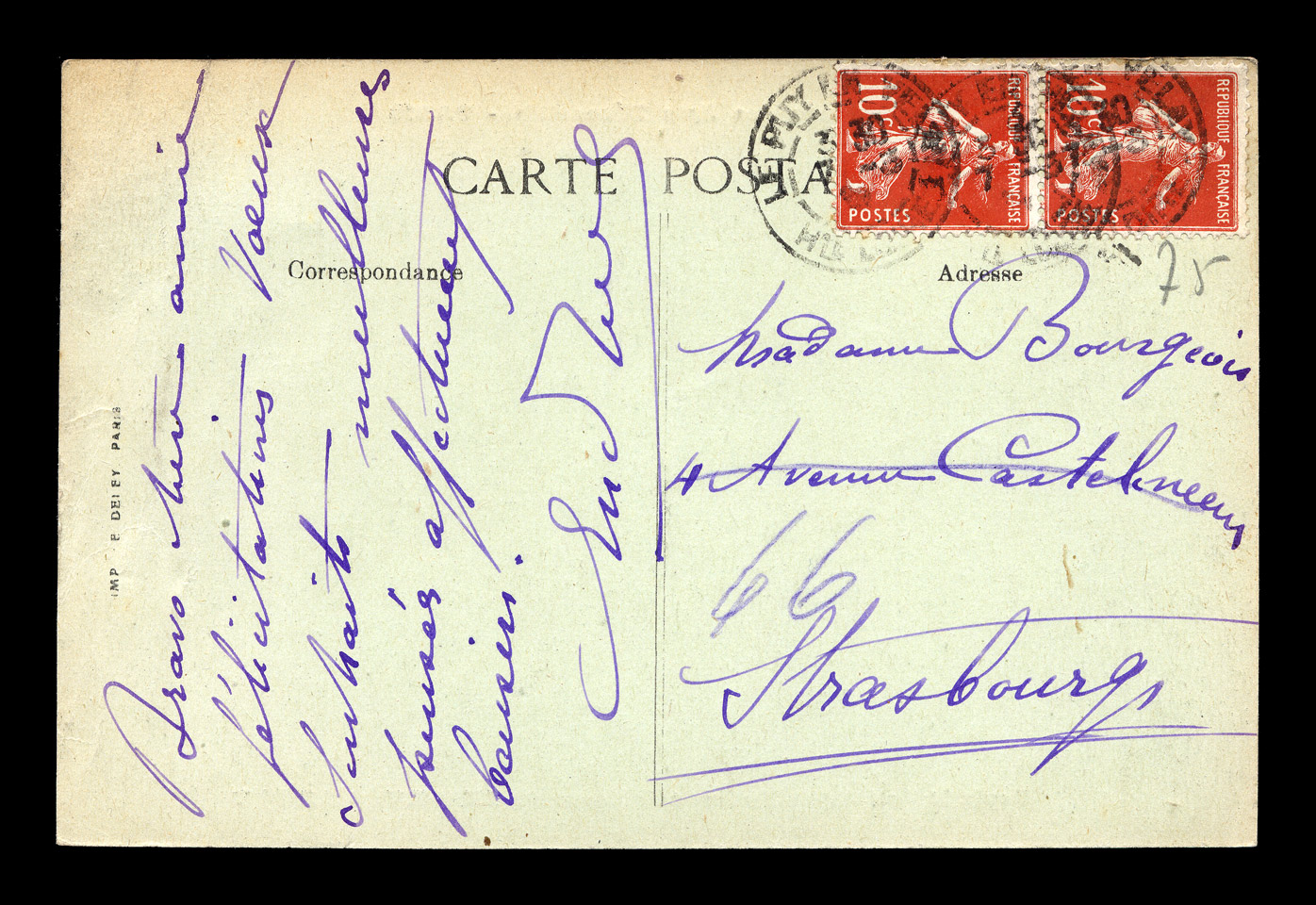 The backsides of postcards are remarkably consistent across different producers, and often provide a clue as to the date of issuance. I have scanned unwritten examples to associate with each card - these are the same as the ones used on each card, but without any writing that might be present on that particular card. Divided backs started to appear in France in 1907, and were in general use by 1910. Click here to return to Musée des Arts Décoratifs postcards. first posted 10/1/2009 |