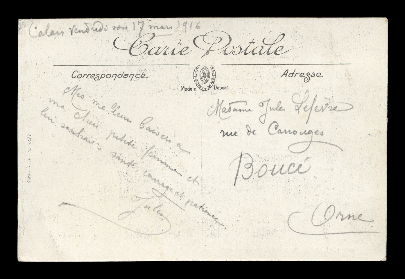 The backsides of postcards are remarkably consistent across different producers, and often provide a clue as to the date of issuance. I have scanned unwritten examples to associate with each card - these are the same as the ones used on each card, but without any writing that might be present on that particular card. Divided backs started to appear in France in 1907, and were in general use by 1910. Click here to return to Lévy Calais postcards. first posted 7/18/2009 |