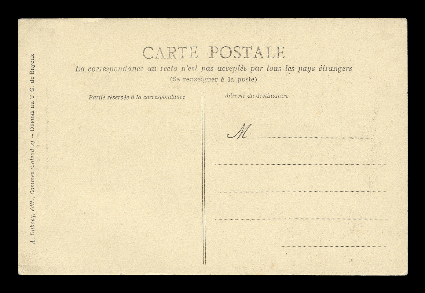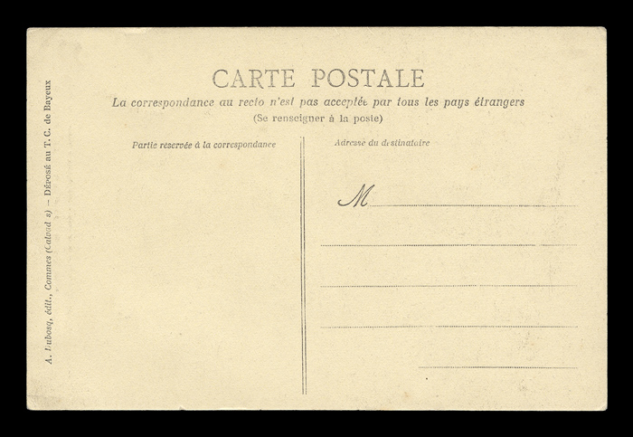 The backsides of postcards are remarkably consistent across different producers, and often provide a clue as to the date of issuance. I have scanned unwritten examples to associate with each card - these are the same as the ones used on each card, but without any writing that might be present on that particular card. Divided backs started to appear in France in 1907, and were in general use by 1910. Click here to return to A. Dubosq postcards. first posted 2/6/2009 |