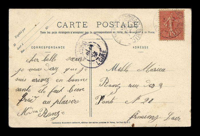 The backsides of postcards are remarkably consistent across different producers, and often provide a clue as to the date of issuance. I have scanned unwritten examples to associate with each card - these are the same as the ones used on each card, but without any writing that might be present on that particular card. Divided backs started to appear in France in 1907, and were in general use by 1910. Click here to return to Margerit-Bremond postcards. first posted 6/22/2009 |