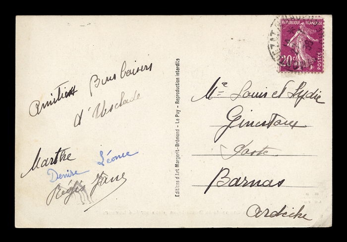 The backsides of postcards are remarkably consistent across different producers, and often provide a clue as to the date of issuance. I have scanned unwritten examples to associate with each card - these are the same as the ones used on each card, but without any writing that might be present on that particular card. Divided back used by some examples of postcards issued by "Éditions d’Art Margerit-Brémond – Le Puy". Divided backs started to appear in France in 1907, and were in general use by 1910. Click here to return to Margerit-Brémond 2 postcards. first posted 2/6/2009 |