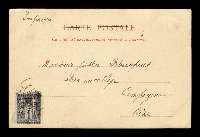 The backsides of postcards are remarkably consistent across different producers, and often provide a clue as to the date of issuance. I have scanned unwritten examples to associate with each card - these are the same as the ones used on each card, but without any writing that might be present on that particular card. Divided backs started to appear in France in 1907, and were in general use by 1910. Note, back is upside down on this one. Click here to return to N.D. Phot postcards. first posted 9/1/2009 |