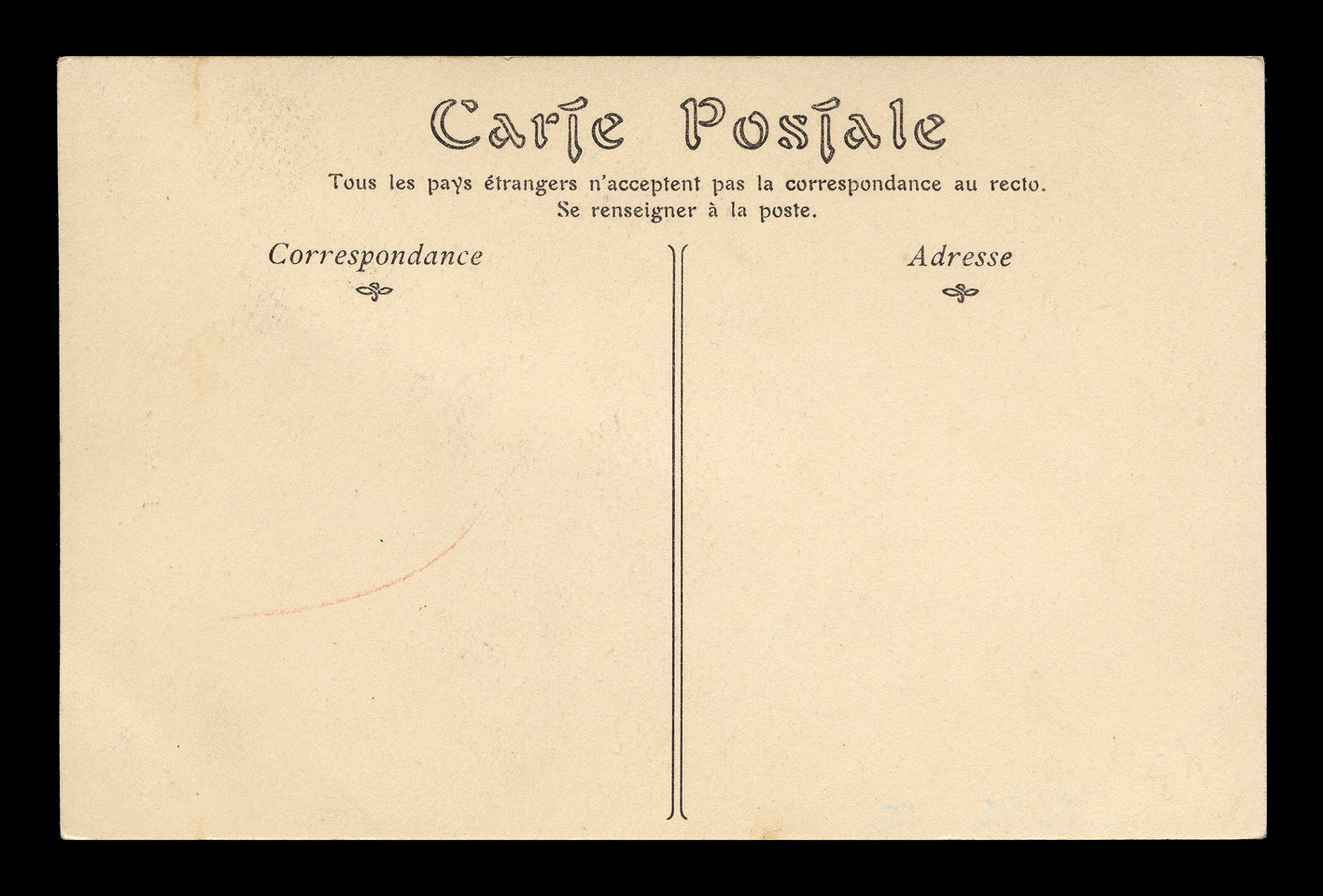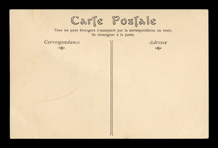The backsides of postcards are remarkably consistent across different producers, and often provide a clue as to the date of issuance. I have scanned unwritten examples to associate with each card - these are the same as the ones used on each card, but without any writing that might be present on that particular card. Divided backs started to appear in France in 1907, and were in general use by 1910. Click here to return to N.D. Phot postcards. first posted 5/5/2009 |