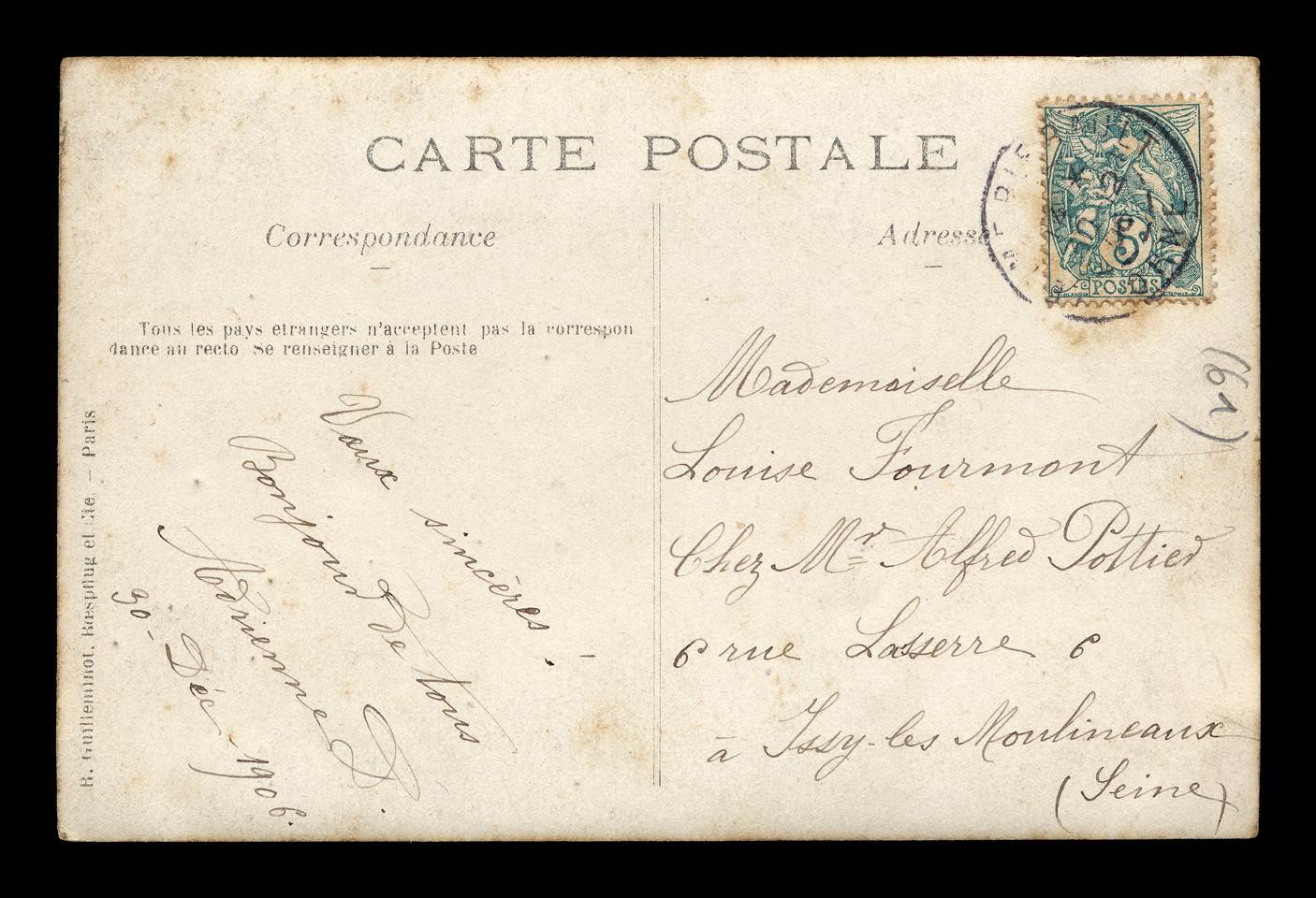 The backsides of postcards are remarkably consistent across different producers, and often provide a clue as to the date of issuance. I have scanned unwritten examples to associate with each card - these are the same as the ones used on each card, but without any writing that might be present on that particular card. Divided backs started to appear in France in 1907, and were in general use by 1910. Click here to return to St. Blaise postcards. first posted 3/30/2009 |