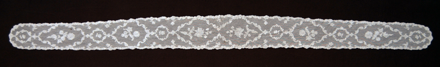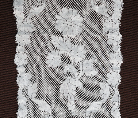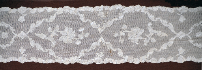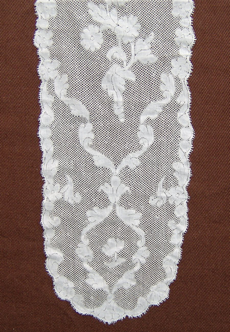 Valenciennes Round-hole lappets 21-3/4" long, 4-1/4" wide at widest point, joined together 'Line drawing' round hole mesh, large flowers. 3 different flower designs along lengths. purchased 11/20/2008 |
