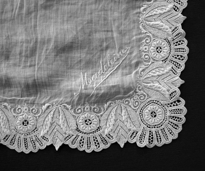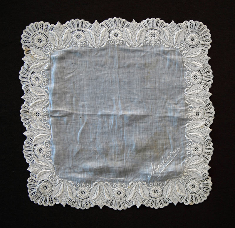 Whitework Embroidery Handkerchief get measurements Notable primarily for the needlelace fillings. Alençon does this type of work, so perhaps this example is French. purchased 08/10/2006 |