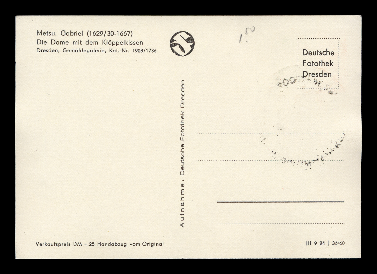 The backsides of postcards are remarkably consistent across different producers, and often provide a clue as to the date of issuance. I have scanned unwritten examples to associate with each card - these are the same as the ones used on each card, but without any writing that might be present on that particular card. Divided backs started to appear in France in 1907, and were in general use by 1910. Click here to return to Metsu maxicard. first posted 10/31/2009 |