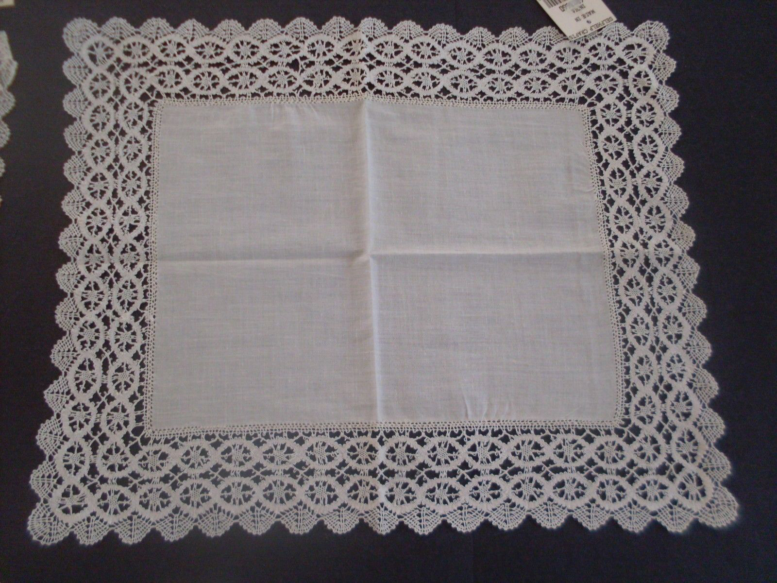 India handkerchiefs 11.5" x 10" each 4 handkerchiefs with beds-type trail edging (2 rows), along with a torchon outer edge. Tag says "SELFHELP CRAFTS, Made in India 6803660" purchased 12/22/2016 |