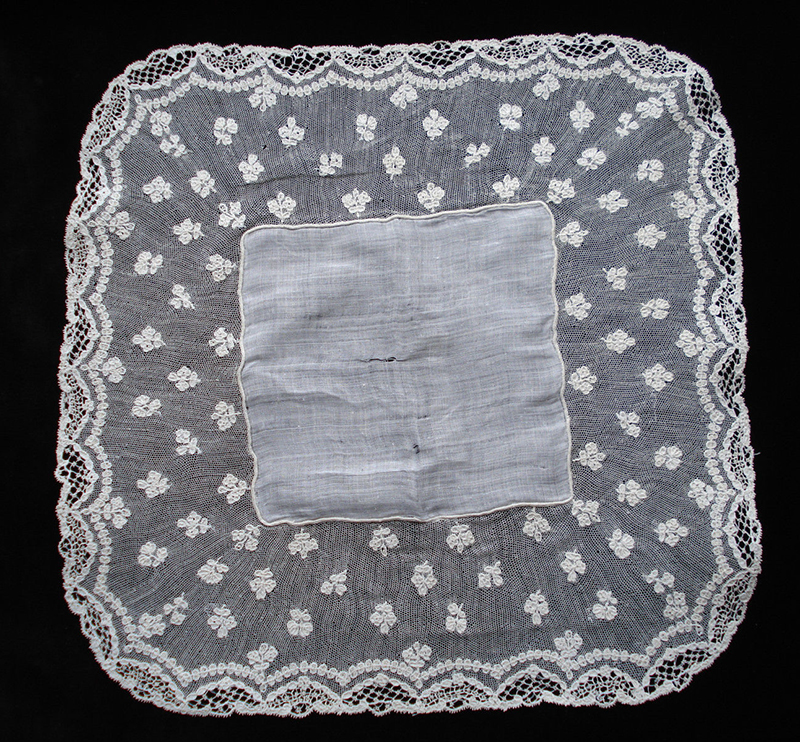12", lace 3" to 3.5" deep Design looks early, very fine reseau, 18th c filling, couched cordonnet. But the handkerchief form is more modern. I think it is a 19th c piece.