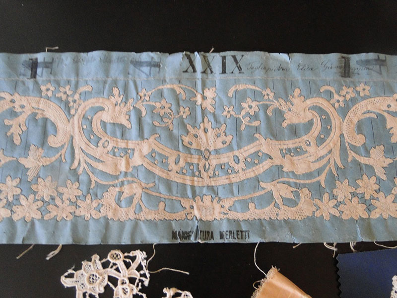 Burano pattern in progress 6" x 18" A Burano pattern on blue paper in the process of execution. "Manufattura Merletti" probably refers to the Jesurum factory in Burano. Works like this are essential since they illustrate the manufacturing process. Note the lines indicating the direction of the ground. And that the motifs were worked before the ground and fillings.