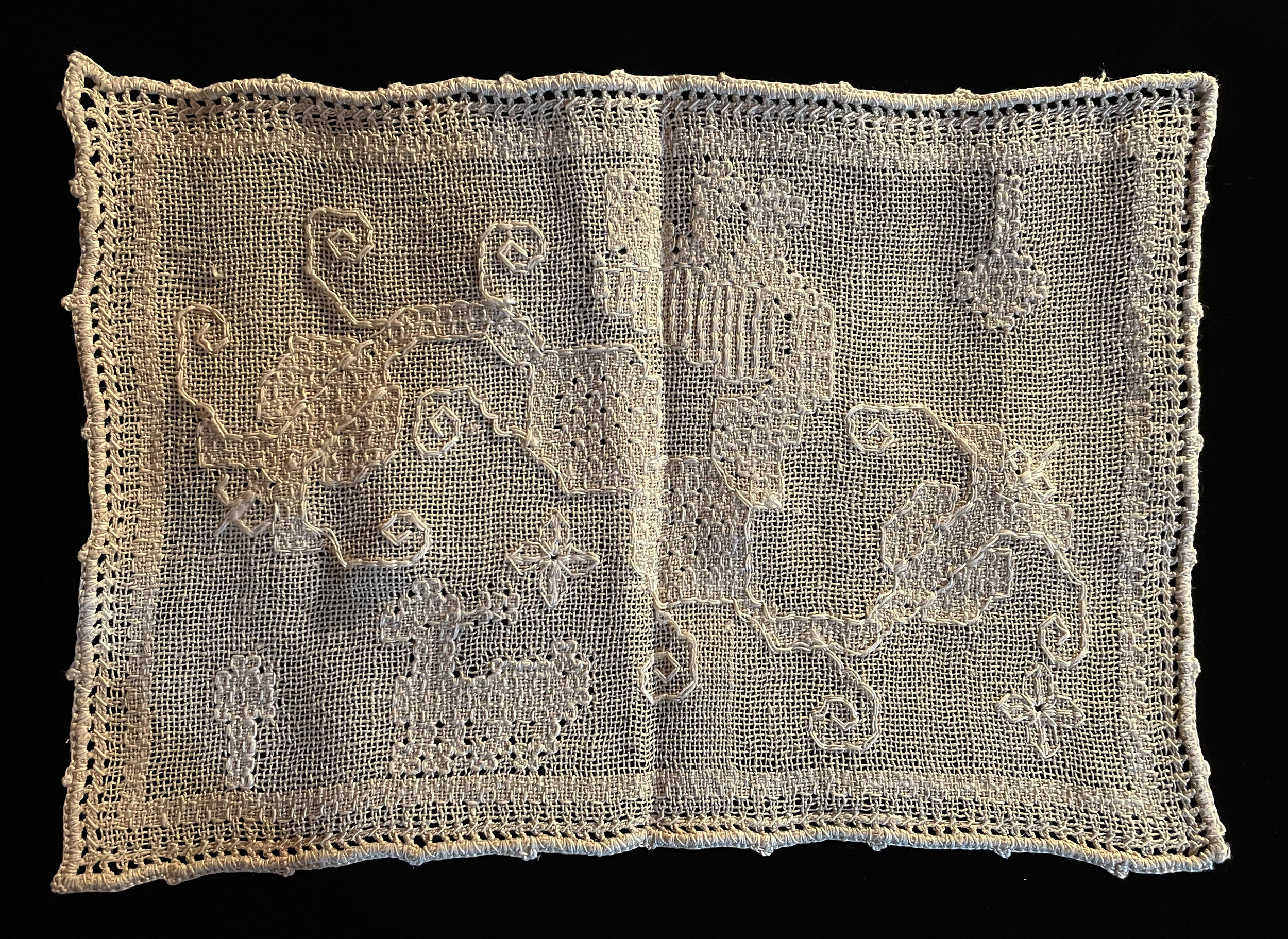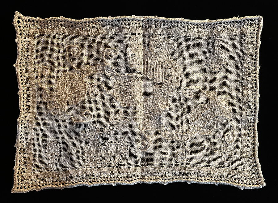10" x 14.5" (25.4cm x 36.83cm) Deruta is a town in Umbria, Italy, famous for pottery. This type of embroidery is worked on a loose plain weave linen cloth. The edge border is crochet with some picots, not sure how this is padded. I recognize the deer in the lower part of the photo, it might be a bird in the upper part. Not sure which is supposed to be the proper orientation. The stitches seem to be double running stitch sometimes worked with two threads. There are some YouTube videos in Italian. This type of work apparently goes back a long time, but has had a recent revival. Can't find much information on the web.