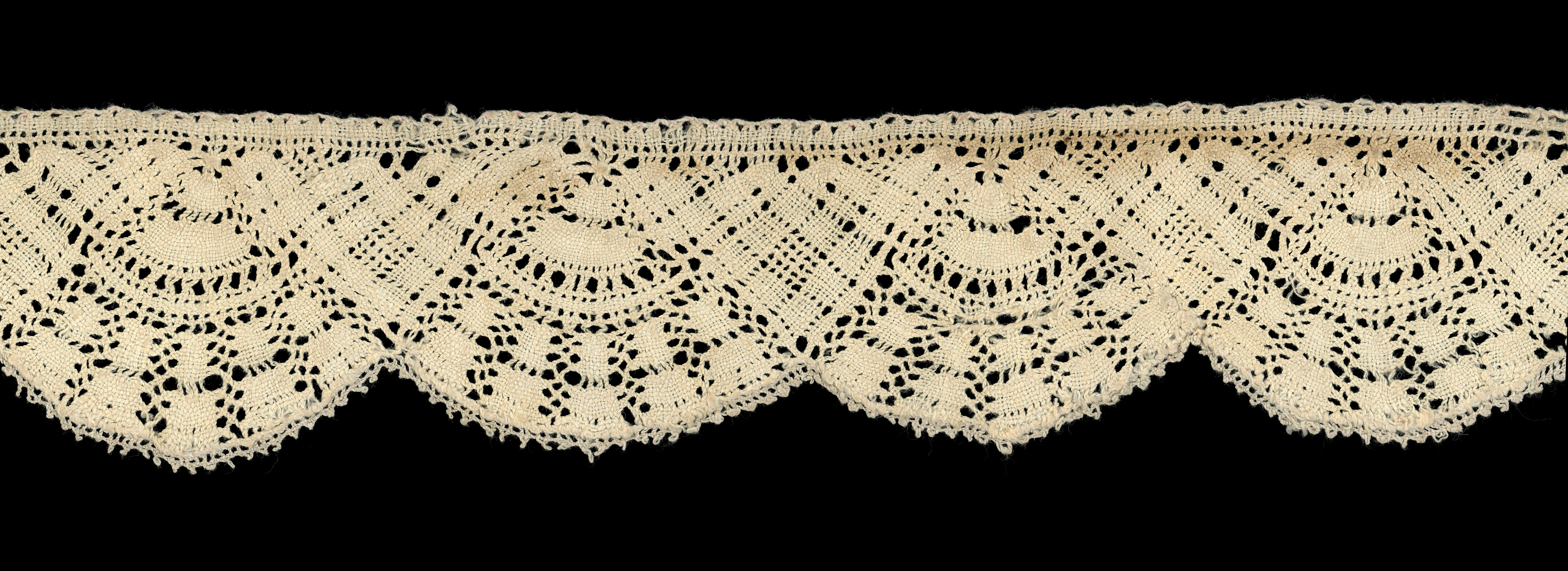In two pieces: Based on the information in the 'comparable', this fan-like bobbinlace is from Pescocostanzo, and could be 19th century. More research is needed.