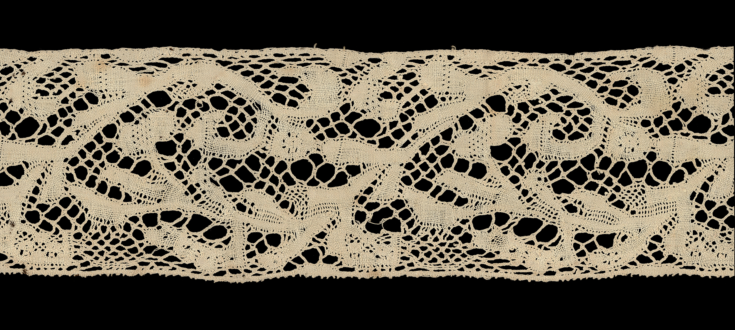 3.5" x 69" Perhaps a Pescocostanzo piece. Highly stylized vine/leaf/floral design with a plaited ground that looks similar to the square Valenciennes mesh. I'll keep it here until more information become available.