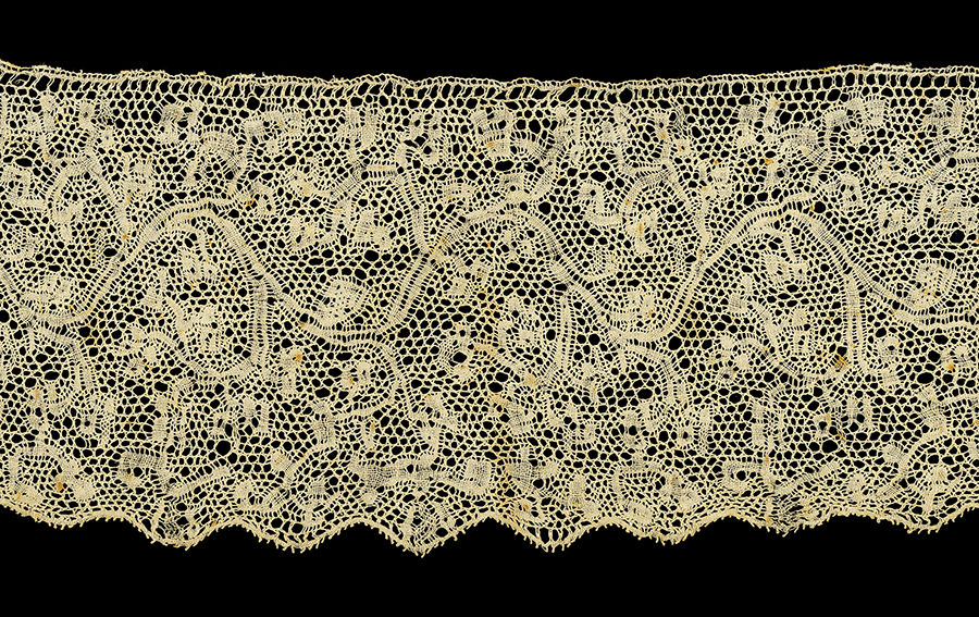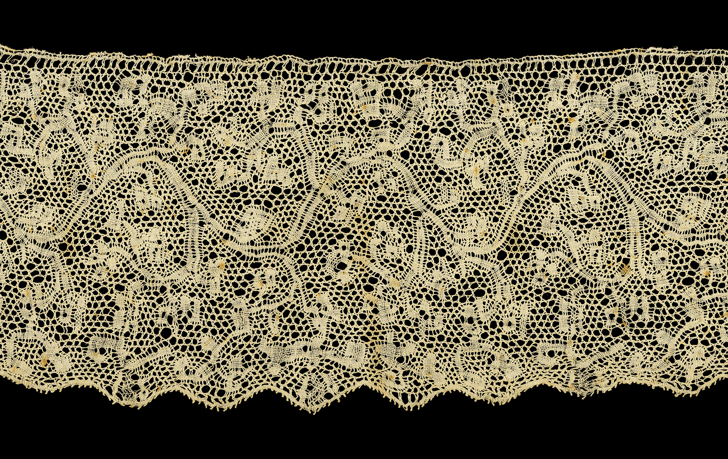 ~5.5"max, irregular x 216" A possible Pescocostanzo freehand lace, with an unusual scalloped lower border. Stylized vine, leaf, and flower design, with a 6-pointed star mesh resembling that of Point de Paris.