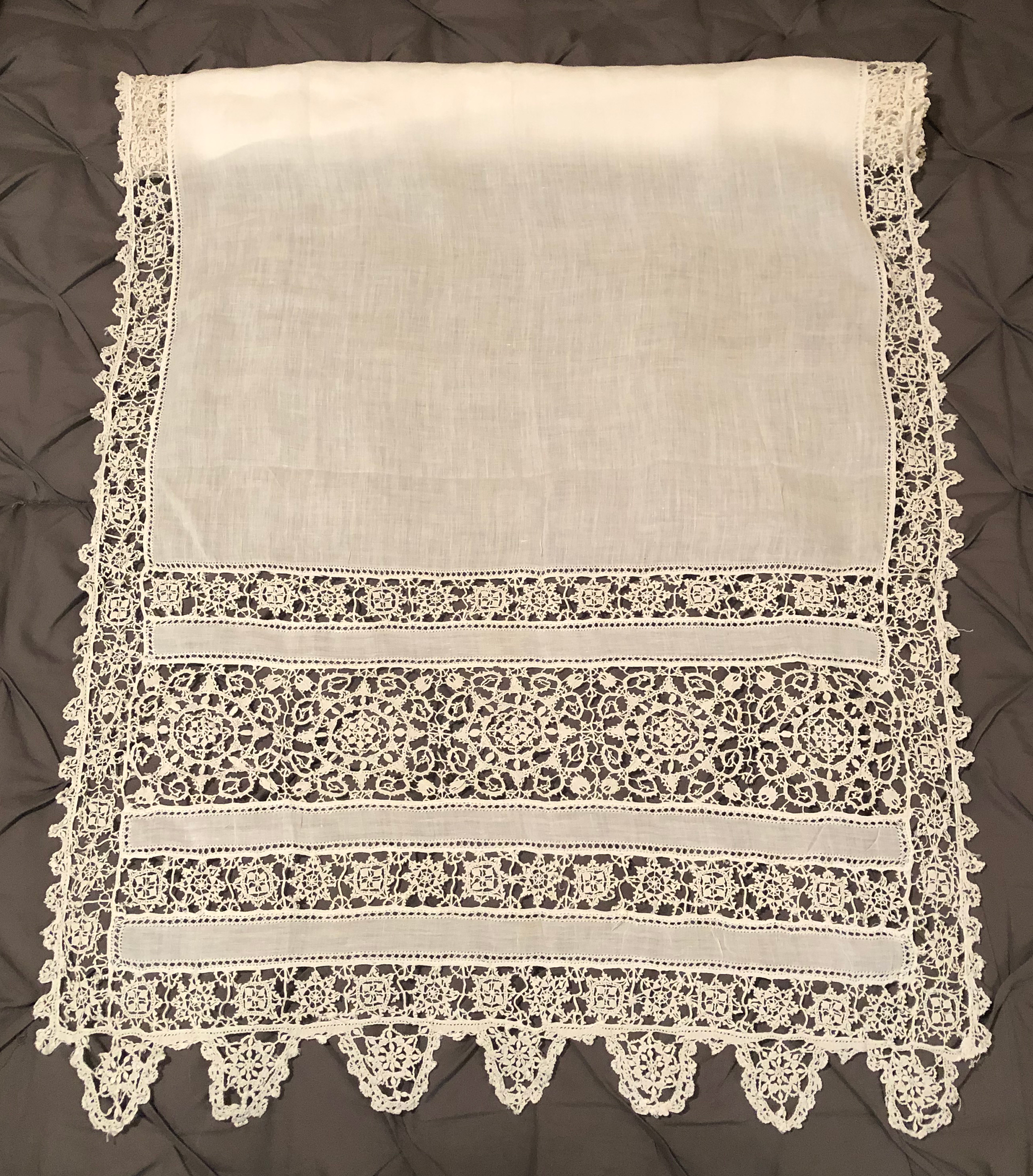 Towel with Punto in Aria inserts and points, Genoese bobbin border 23" x 62" The cloth looks like cotton, with linen lace. Punto in Aria insertions in the towel ends. The narrower Punto in Aria design also runs up the towel outer edges. All the needle-made elements have a plaited thread base along the edges. The whole towel is surrounded by a Genoese-type plaited bobbinlace, narrow on the sides, larger at the ends. This piece resembles Punto-in-Aria_border_3, probably a modern Italian copy. It is an example of a complete 'towel' or similar linen, probably made for display purposes.