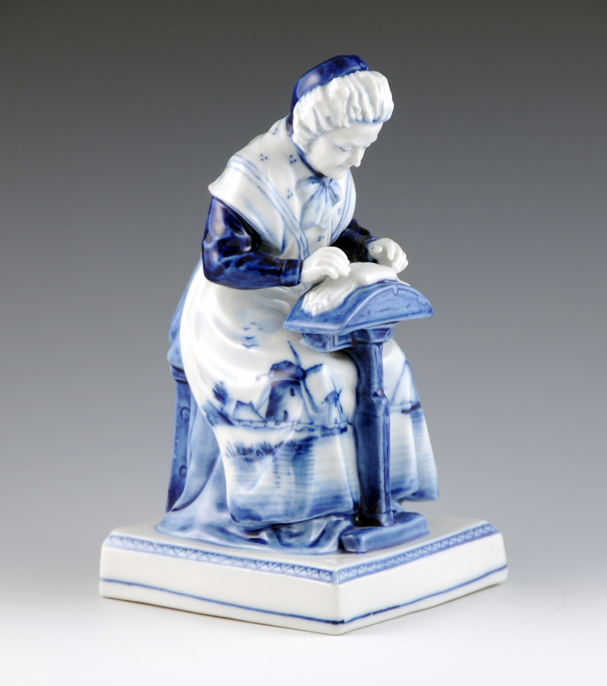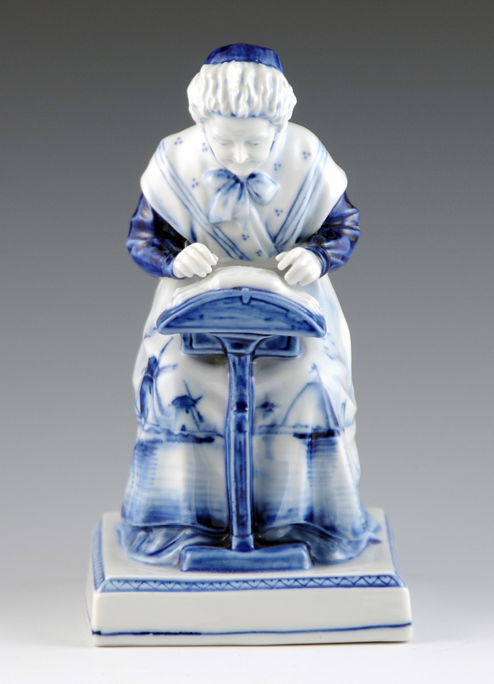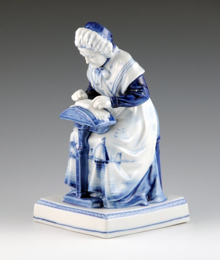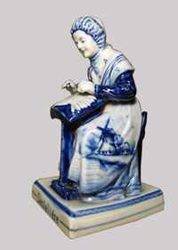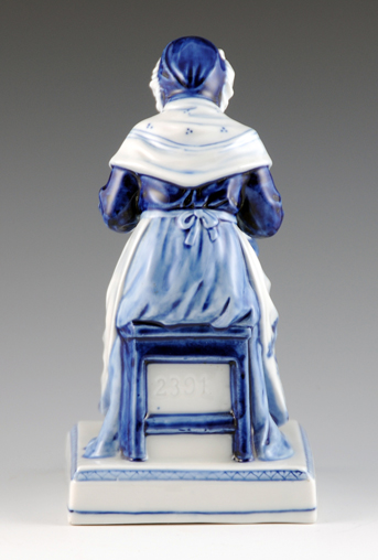 Delft Lacemaker 6-1/4" high, 3-1/4" long, 3-1/4" wide There is no maker’s mark on this piece, but there is a number, 2391 on the back in the upper open space of the chair. This figure is very beautiful; the glaze is so translucent that it is a bit hard to photograph. The modeling is excellent, and the scenes of windmills on her skirt apron are delightful. The pillow is too short to be practical, but the overall effect is wonderful. I don’t know the date of the piece, but guess early 20th century.