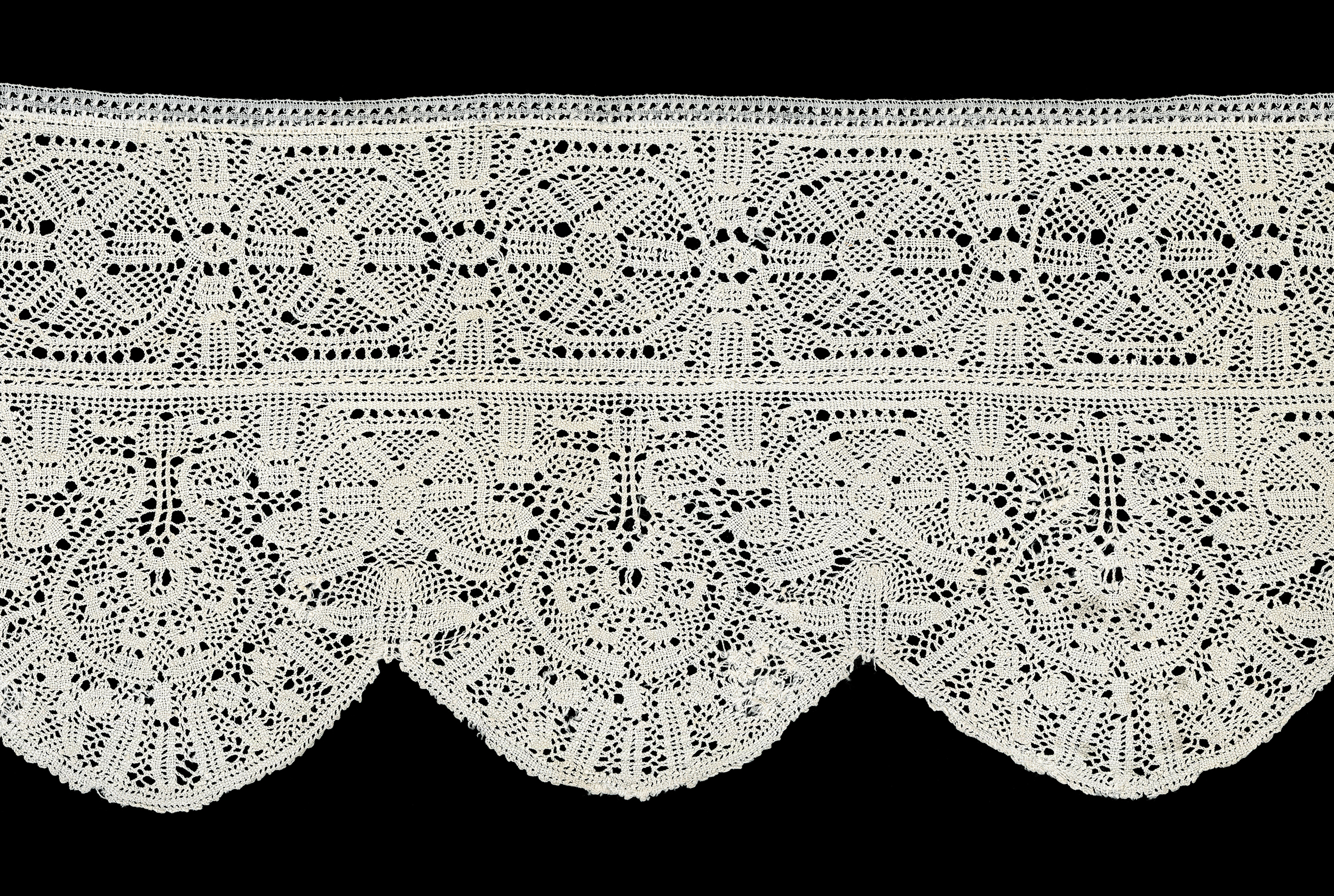 Very good condition. Four of the scallop edges are frayed, three repaired. Minor fraying along lower edge elsewhere, occasional broken thread near the scallops. One repair along the top of the insertion, 2-3/4" x 1" located 11.5" from one end, combination needle and bobbinlace patch. The upper edge appears intact, but it's hard to tell since the engrelure is complex and sewn over the edge. One end cut, the other end partially folded over and hemmed.