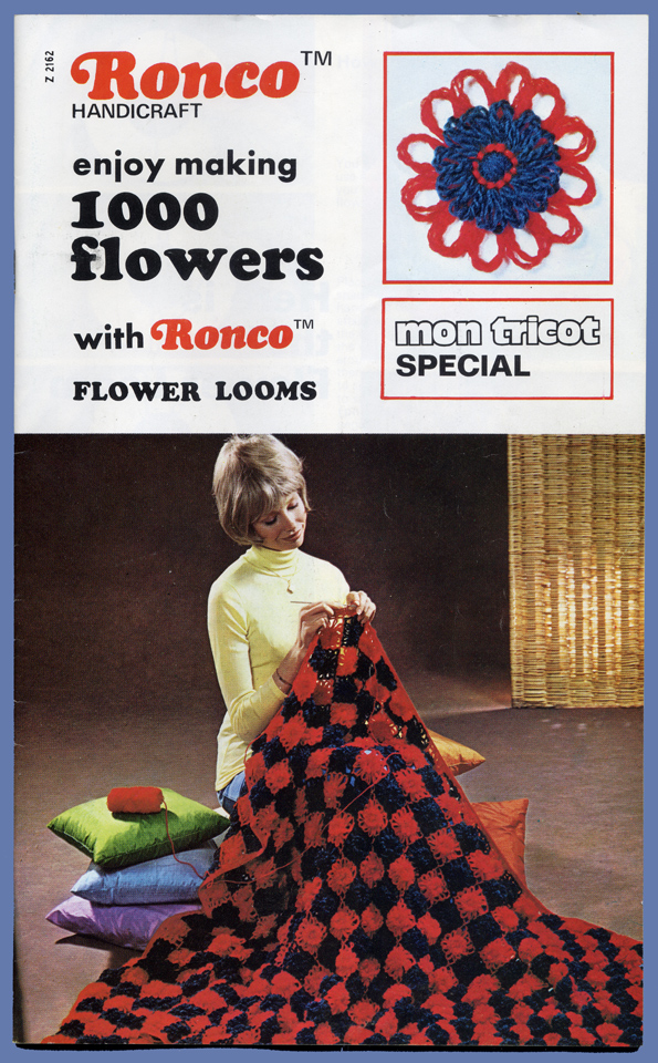 Title: Enjoy making 1000 flowers with Ronco Flower Looms Author: unknown Date: unknown Publisher: Mon Tricot Instructions packaged with the Ronco Flower Loom. A scan of this work is not available.