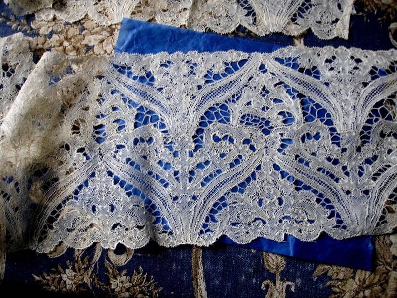Chantilly guipure border ~7.5" x 7 meters An extremely interesting border or insertion of "guipure", without point ground - looks like white cotton, which could mean Belgium. Seems to be all half stitch (check this) with gimp. Might be a white Chantilly guipure. A little loosely worked. Honeycomb brides, honeycomb variation fillings. Purchased by the seller from Drouet. It came with an old blue tag attached with a red loop thread reading