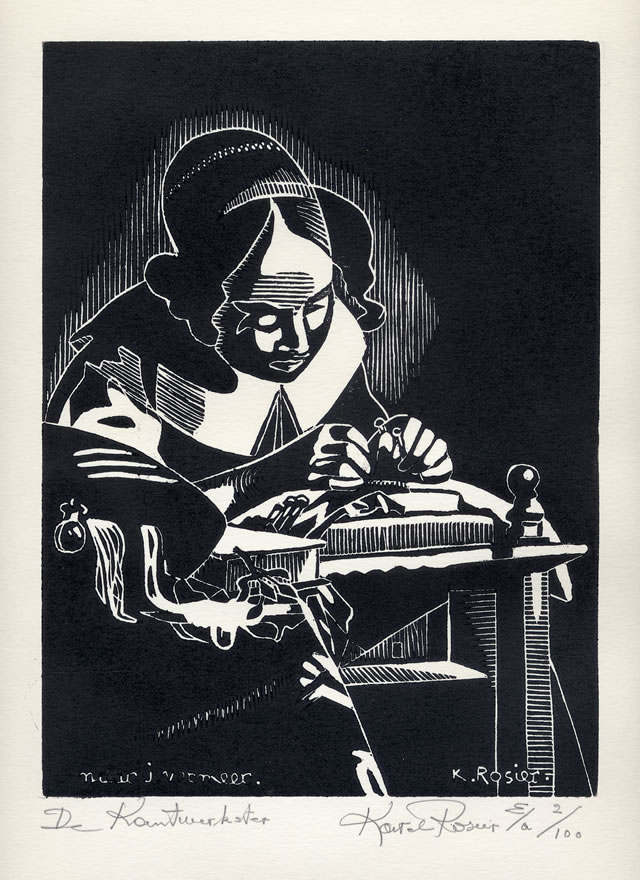 A woodcut titled “De Kantwerkster”, signed by Karel Rosier below the print in pencil. This example is #2 out of 100 produced. The picture portion measures 7-1/8" x 9-1/2". The entire sheet measures 12-1/8" x 15-7/8".